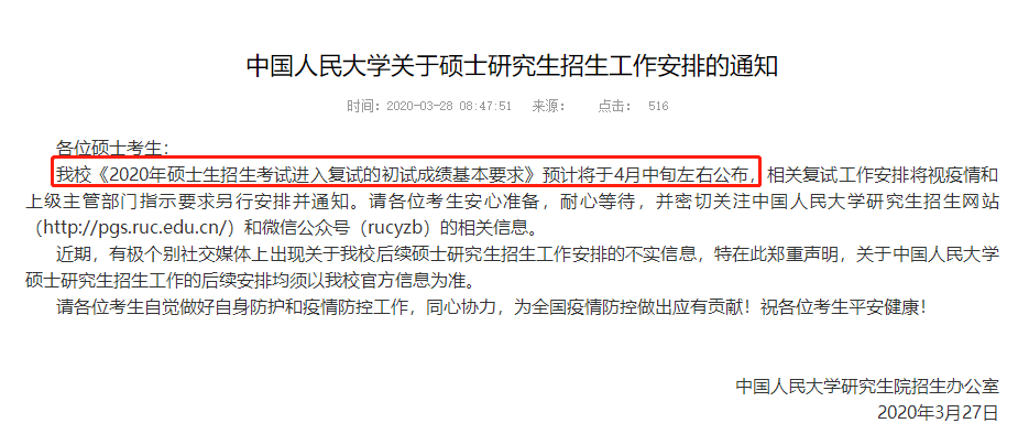 今日,中國人民大學(xué)官網(wǎng)發(fā)布通知:“《2020年碩士生招生考試進入復(fù)試的初試成績基本要求》預(yù)計將于4月中旬左右公布”。