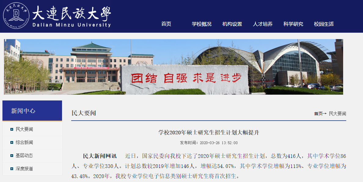 民大新聞網(wǎng)訊 近日,國(guó)家民委向我校下達(dá)了2020年碩士研究生招生計(jì)劃,總數(shù)為416人,其中學(xué)術(shù)學(xué)位86人、專業(yè)學(xué)位330人。計(jì)劃總數(shù)較2019年增加146人,增幅達(dá)54.07%,其中學(xué)術(shù)學(xué)位增幅為115%、專業(yè)學(xué)位增幅為43.48%。2020年,我校專業(yè)學(xué)位電子信息類別碩士研究生將首次招生。