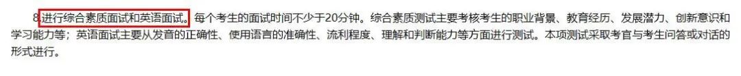 進(jìn)行綜合素質(zhì)面試和英語面試。每個考生的面試時(shí)間不少于20分鐘。綜合素質(zhì)測試主要考核考生的職業(yè)背景、教育經(jīng)歷、發(fā)展?jié)摿?、?chuàng)新意識和學(xué)習(xí)能力等;英語面試主要從發(fā)音的正確性、使用語言的準(zhǔn)確性、流利程度、理解和判斷能力等方面進(jìn)行測試。本項(xiàng)測試采取考官與考生問答或?qū)υ挼男问竭M(jìn)行。