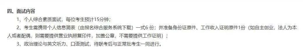 考生需攜帶個人信息簡表(由報(bào)名綜合服務(wù)系統(tǒng)下載)一式6 份;并準(zhǔn)備身份證原件、工作收入證明原件1份(如自主創(chuàng)業(yè),法人為本人或者配偶,則需要提供營業(yè)執(zhí)照復(fù)印件,加蓋公章,不需要提供工作證明);