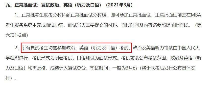 所有復(fù)試考生均需參加政治、英語(聽力及口語)考試。政治及英語聽力筆試由中國人民大學(xué)組織進(jìn)行,考試形式為閉卷考試,口語測試為面試形式??荚嚽皶伎荚嚪秶?。政治及英語(聽力及口語)均需及格,成績計(jì)入復(fù)試總分。筆試時(shí)間:一般為3月份(將于聯(lián)考后另行公布具體安排)。