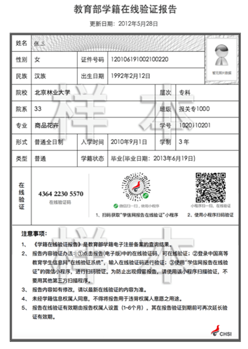 非應(yīng)屆生考生未通過學(xué)歷校驗(yàn)的必須上傳《教育部學(xué)歷證書電子注冊備案表》或《中國高等教育學(xué)歷認(rèn)證報(bào)告》或《國外學(xué)歷學(xué)位認(rèn)證書》(三者之一均可)的圖片1張;其中,如果是尚未取得本科畢業(yè)證書的自考考生和網(wǎng)絡(luò)教育考生,僅需上傳成績單或?qū)W生證(兩者或兩者之一均可)。樣稿如下: