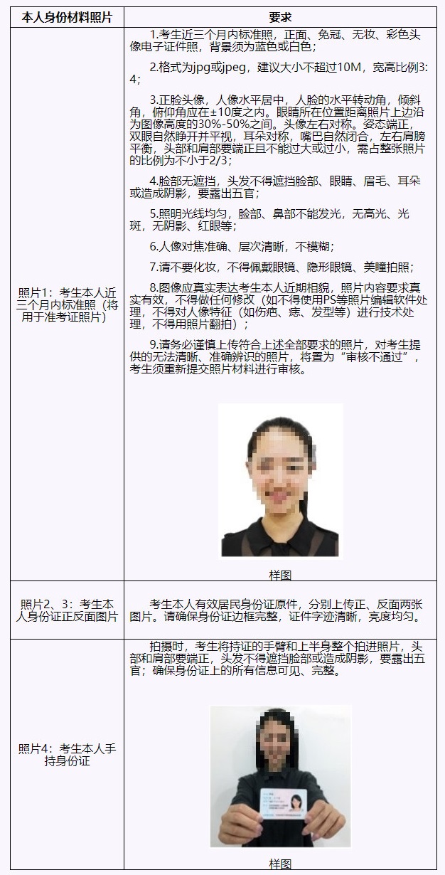 以上考生身份材料照片,考生均不得化妝,不得佩戴眼鏡、隱形眼鏡、美瞳等;照明光線均勻,臉部無高光、光斑,無陰影、紅眼等;頭發(fā)不得遮擋臉部或造成陰影,要露出五官,并能如實(shí)地反映本人近期相貌(不可用Photoshop等各類照片編輯軟件處理,不可用照片進(jìn)行翻拍)。