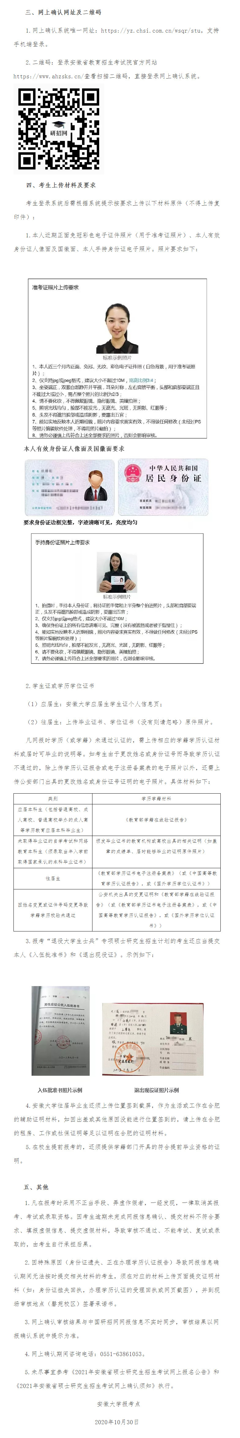 今年安徽大學(xué)報(bào)考點(diǎn)實(shí)行網(wǎng)上確認(rèn)報(bào)名信息,確認(rèn)期間將在網(wǎng)上審核考生上傳的材料并通過(guò)系統(tǒng)向考生反饋審核結(jié)果。請(qǐng)所有考生務(wù)必仔細(xì)閱讀此公告要求,及時(shí)查看審核結(jié)果,并按要求在規(guī)定時(shí)間內(nèi)補(bǔ)充(修改)有關(guān)材料。未在規(guī)定時(shí)間進(jìn)行網(wǎng)上確認(rèn)以及未被審核通過(guò)的考生,報(bào)名信息無(wú)效,將不得參加考試。