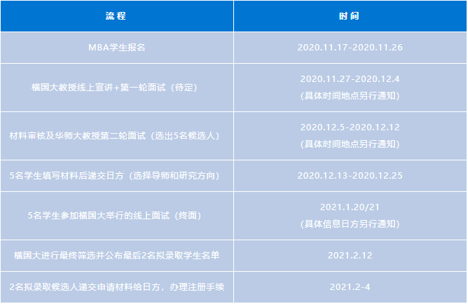 a) 本次雙學(xué)位項(xiàng)目名額有限,華東師范大學(xué)MBA項(xiàng)目2020級(jí)及2019級(jí)在讀學(xué)生均可報(bào)名。工作組將根據(jù)報(bào)名情況開展材料審核、面試和錄取工作,選拔時(shí)間安排如下: