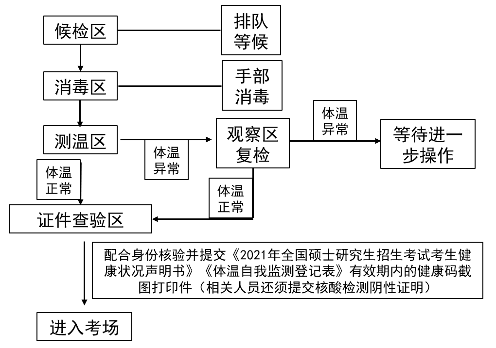 三、考生憑準(zhǔn)考證、有效身份證件、在有效期內(nèi)且顯示“綠色碼:請通行”字樣的“健康碼”截圖A4紙打印件(須本人簽字)進(jìn)入考點。為避免人員聚集,確保能準(zhǔn)時到達(dá)指定考場,考生每場考試須提前一小時到達(dá)考點候檢區(qū)排隊等候。進(jìn)入考點流程如下: