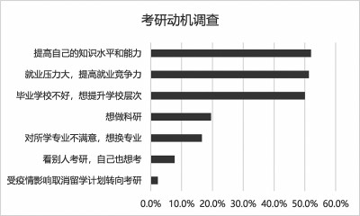 通過對考研動機的調(diào)查分析,超過半數(shù)考生讀研目的是為了提升自身的知識水平和能力,以及由于就業(yè)壓力大,提高就業(yè)競爭力;認為畢業(yè)學校不好,想提升學校層次為另外一個重要因素。此外,受疫情因素影響導致出國留學受阻轉(zhuǎn)向國內(nèi)考研成為新的考研動因。