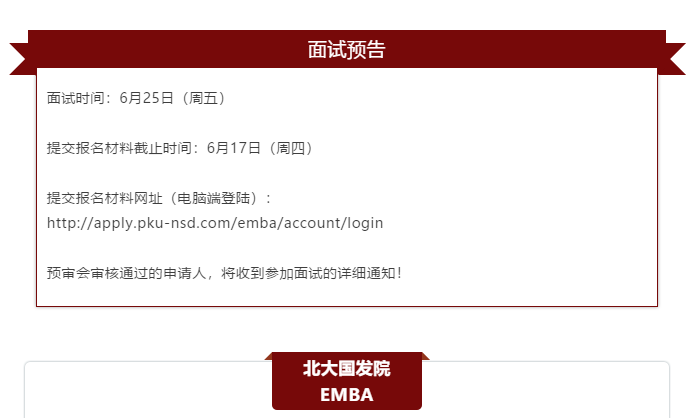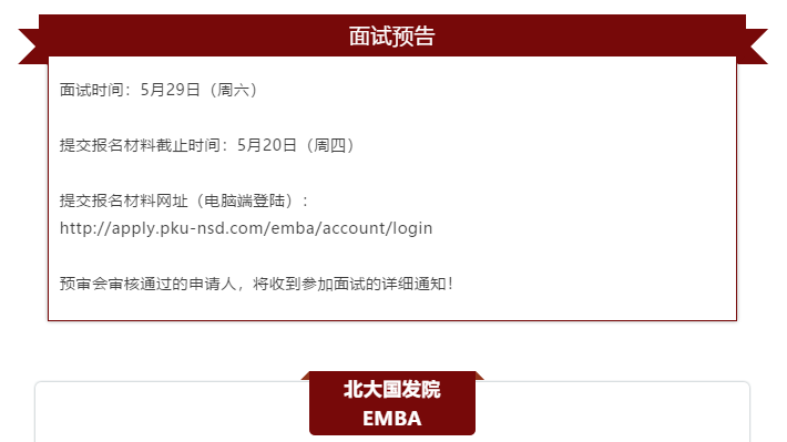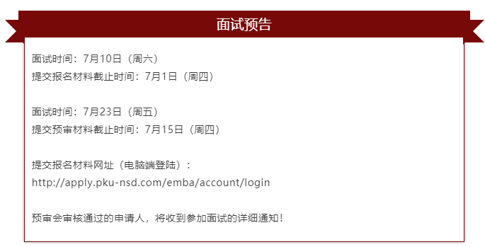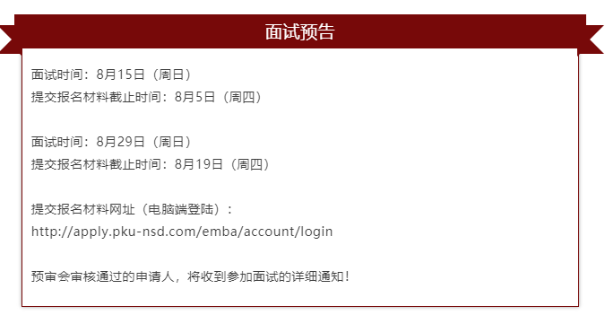 申請(qǐng)人完整填寫北大國(guó)發(fā)院EMBA申請(qǐng)資料后,由國(guó)發(fā)院招生專家組對(duì)申請(qǐng)資料進(jìn)行審查,通過審查者獲得面試資格。