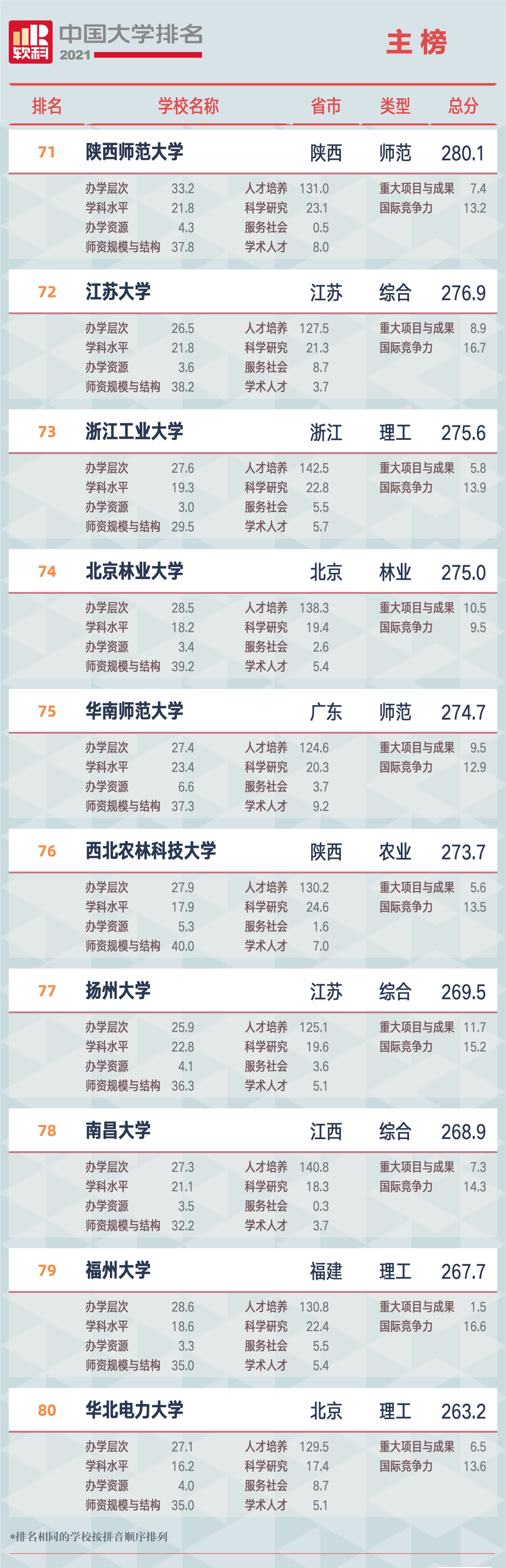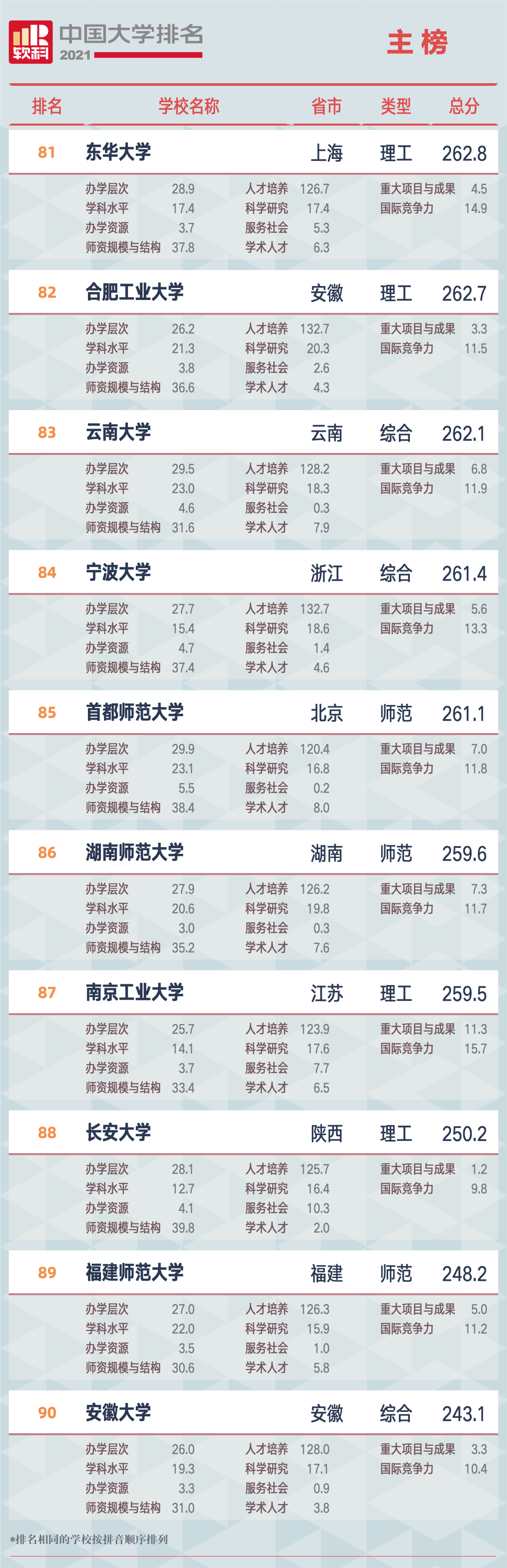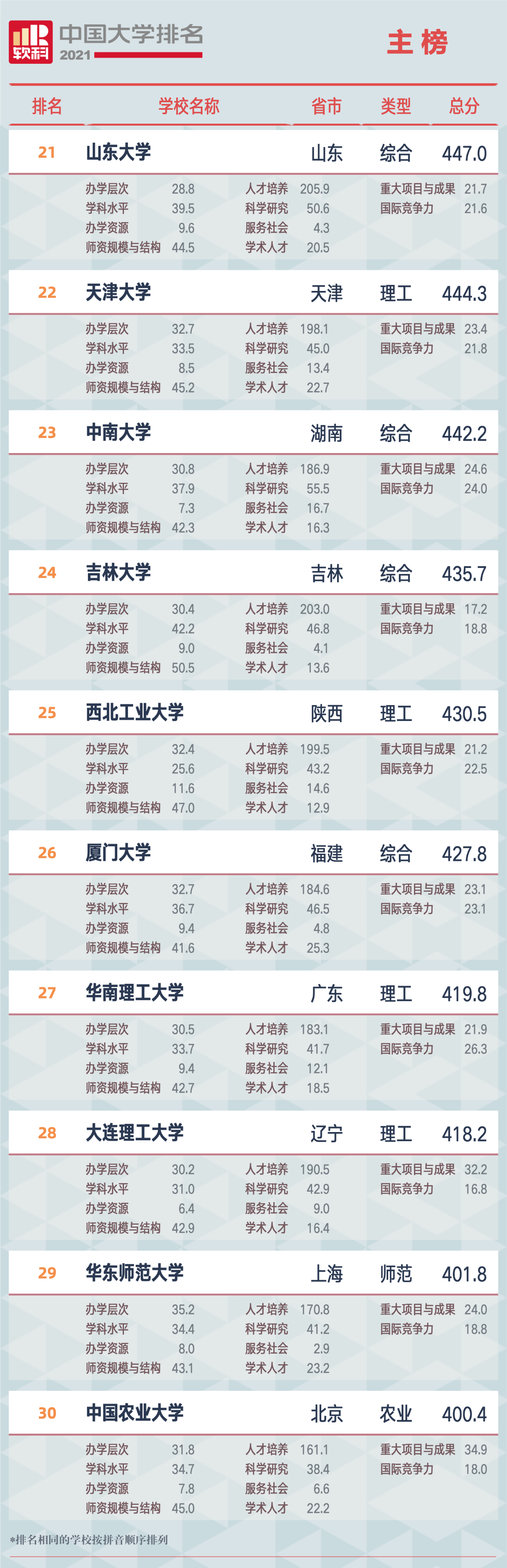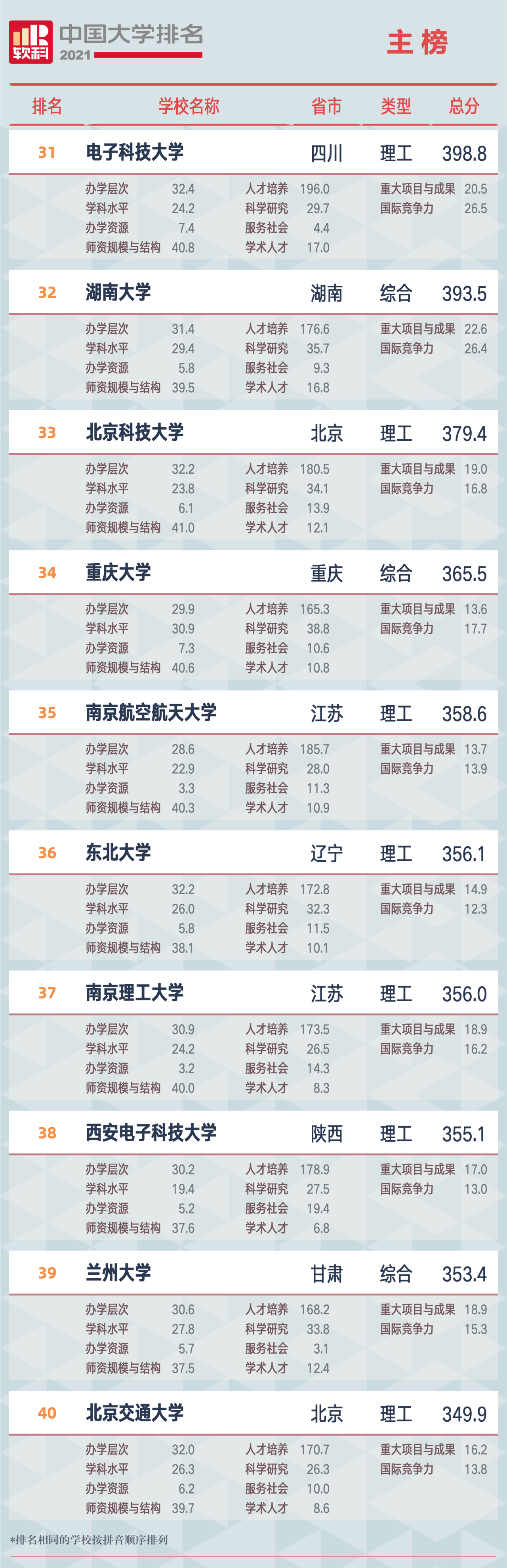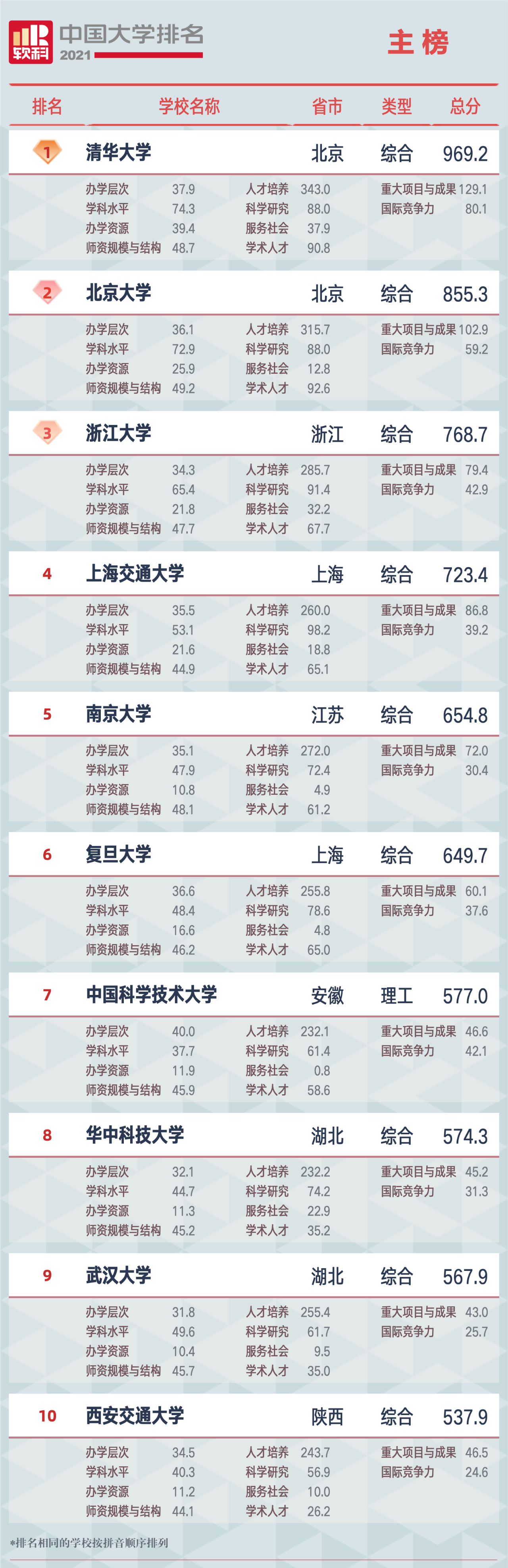 “軟科中國大學排名”,前身是“軟科中國最好大學排名”, 自2015年首次發(fā)布以來,以專業(yè)、客觀、透明的優(yōu)勢贏得了高等教育領域內外的廣泛關注和高度認可,已經成為具有重要社會影響力和權威參考價值的中國大學排名領先品牌。軟科中國大學排名以服務中國高等教育發(fā)展和進步為導向,緊跟國家高等教育的方針、政策,用中國標準評價中國高校。2021軟科中國大學排名(主榜)的上榜高校共有582所,清華大學、北京大學、浙江大學占據(jù)前三,上海交通大學、南京大學位列全國前五。
