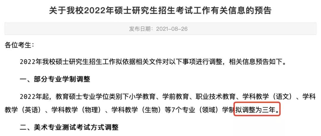 8月26日,河北師范大學(xué)發(fā)布通知:2022年起,教育碩士專業(yè)學(xué)位類別下小學(xué)教育、學(xué)前教育、職業(yè)技術(shù)教育等7個(gè)專業(yè)(領(lǐng)域)學(xué)制擬調(diào)整為三年。