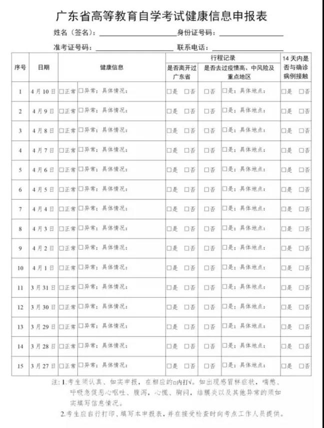 ③12月11日起,所有考生均須進(jìn)行考前14天自我健康觀察,每天如實(shí)在廣東省教育考試院微信公眾號(hào)“辦事服務(wù)”——“健康上報(bào)”中提交本人健康狀況和行動(dòng)軌跡等相關(guān)信息,如實(shí)填寫(xiě)考前14天個(gè)人健康信息申報(bào)表,并在參加每場(chǎng)考試時(shí)提交考點(diǎn)工作人員。