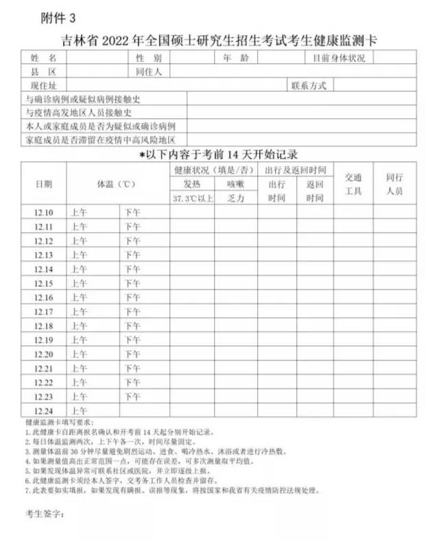 ②做好自我健康監(jiān)測(cè)。從考前第14天開(kāi)始,所有考生需下載、填寫(xiě)《吉林省2022年全國(guó)碩士研究生招生考試考生健康監(jiān)測(cè)卡》(詳見(jiàn)吉林省教育考試院官方網(wǎng)站,請(qǐng)考生自行下載打印),填報(bào)個(gè)人身體狀況。