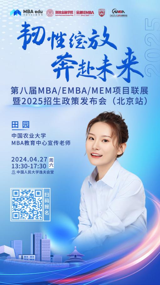 2024年4月27日,由中國MBA教育網(wǎng)、中國人民大學(xué)財政金融學(xué)院EMBA中心聯(lián)合主辦的第八屆MBA/EMBA/MEM項目聯(lián)展暨2025招生政策發(fā)布會(北京站)正式啟幕,全國首場將聯(lián)合北京地區(qū)20多所MBA/EMBA/MEM院校,以項目為主角,打造院校一年一度的大型項目聯(lián)展暨2025招生政策發(fā)布會活動。