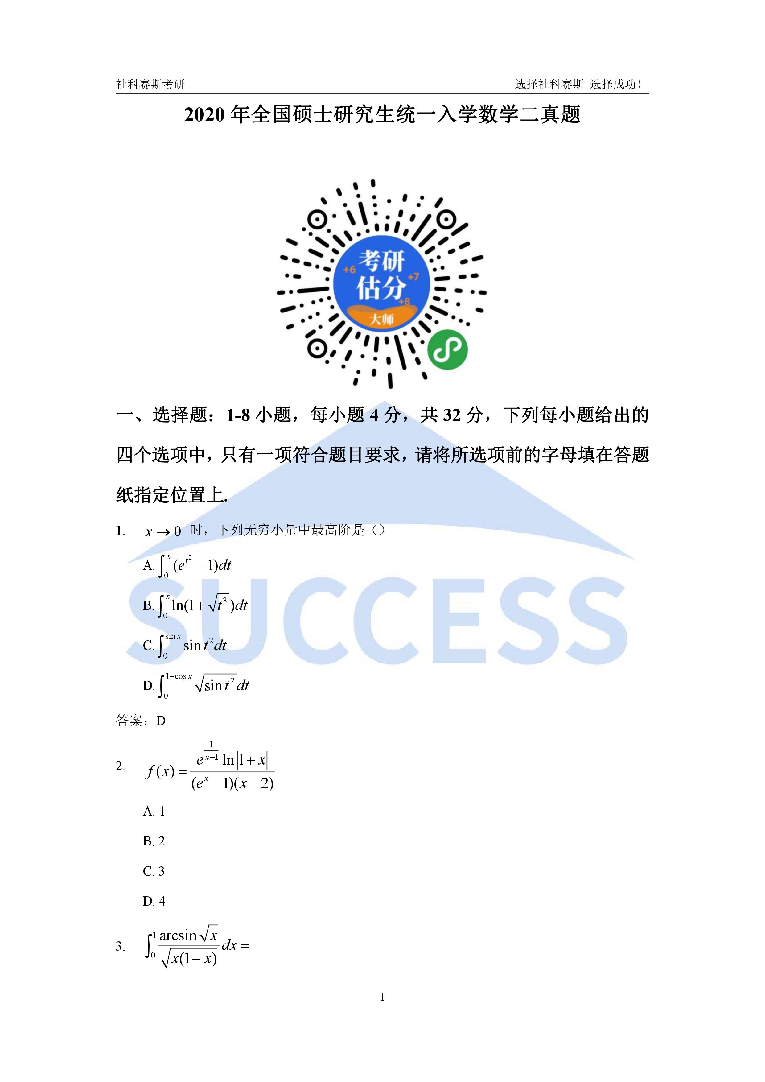相關(guān)熱詞搜索: 考研真題 2020年考研數(shù)學(xué)二真題 2020年考研數(shù)學(xué)二答案