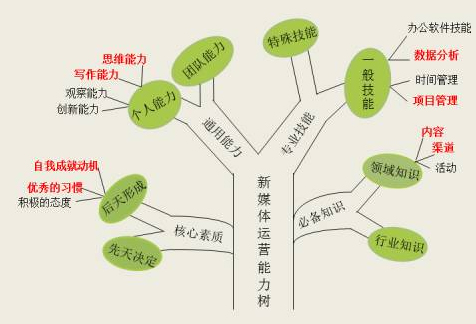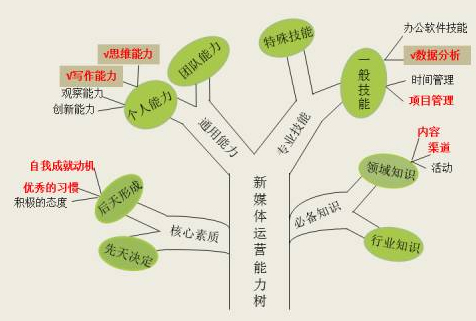 我們已經(jīng)知道,參考管理咨詢顧問這一相當萬金油的行業(yè),80%的能力樹樹干上可以分出4個枝杈:核心素質、通用能力、專業(yè)技能和各類知識。下圖是YouCore某位“新媒體運營”崗位的同事在這四大分類下識別出的自己的優(yōu)勢能力,也即紅葉子。