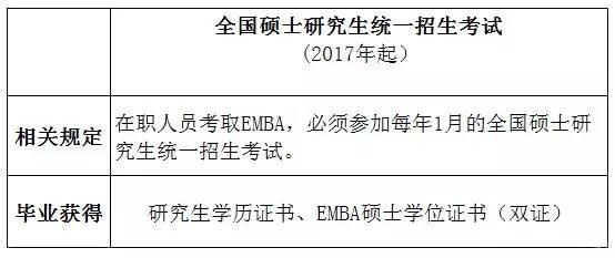 2016年4月,全國工商管理碩士(MBA)教育指導(dǎo)委員會出臺《教育部關(guān)于進(jìn)一步規(guī)范工商管理碩士專業(yè)學(xué)位研究生教育的意見》,規(guī)定從2017年起,高級管理人員工商管理碩士(EMBA)統(tǒng)一納入每年1月的全國碩士研究生統(tǒng)一招生考試。自2016年12月1日起,各培養(yǎng)院校不再自行組織高級管理人員工商管理碩士專業(yè)學(xué)位研究生招生考試。