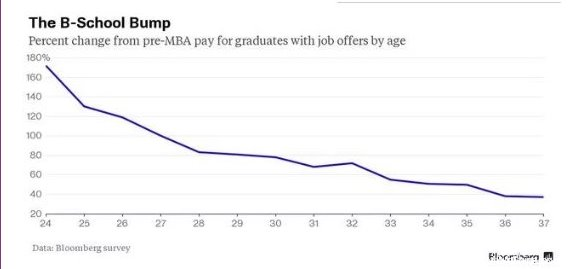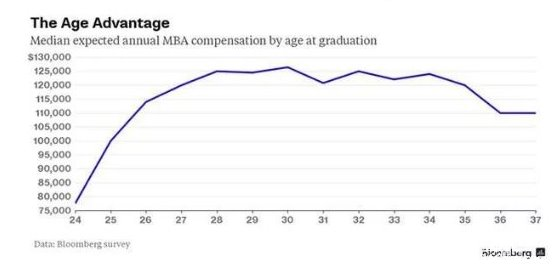2014年調(diào)查了10000名全職MBA畢業(yè)生后發(fā)現(xiàn),在30歲之前,得到MBA學(xué)位的年紀(jì)越大,薪水也就越高。這也能夠解釋的清楚:一個(gè)28歲的MBA畢業(yè)生比一個(gè)24歲的有更多經(jīng)驗(yàn)和教育。令人驚奇的是,30歲之后,經(jīng)驗(yàn)和教育帶來(lái)的優(yōu)勢(shì)迅速下降。
