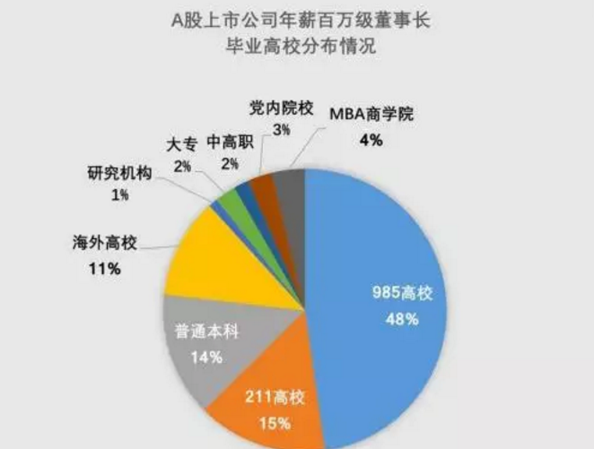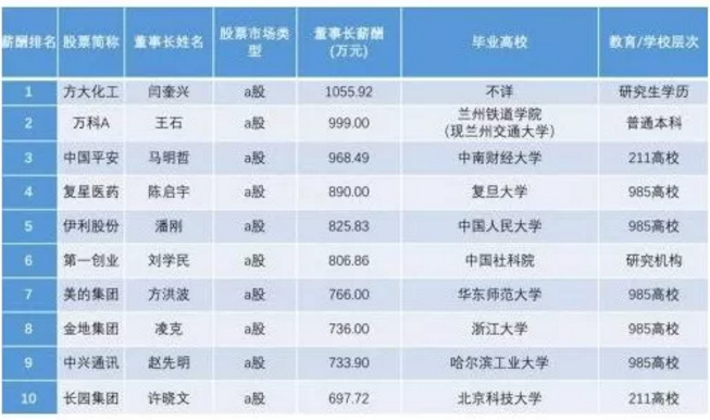 從上面的榜單我們可以看出,A股上市收入排前十的高管985學(xué)歷就占了5個,除了閆奎興和王石之外,其他8人均來自國內(nèi)重點(diǎn)本科高校。