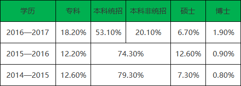 從學(xué)歷上我們能看出來,本科和碩士相對來說有所下降,??坪筒┦坑兴仙?,由此可以看出,??坪筒┦康母偁幰笥诒究坪痛T士,不管什么學(xué)歷競爭激烈程度是一年比一年有所上升的,都不可以掉以輕心。
