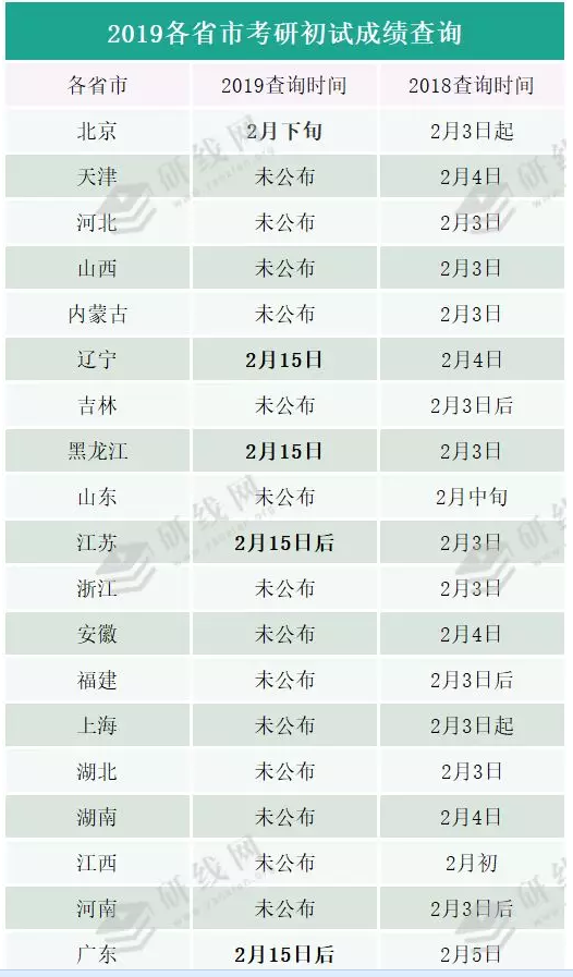 導讀:2019年考研初試結(jié)束后,研線菌根據(jù)各招生單位歷年分數(shù)線公布時間,推算今年初試成績將從春節(jié)結(jié)束第一周(2月中上旬)開始陸續(xù)公布,以下為大家整理的19考研各省市最新成績查詢時間,之后會陸續(xù)更新 。