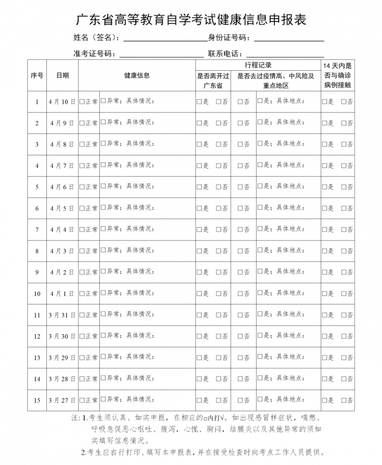 3?? 12月11日起,所有考生均須進(jìn)行考前14天自我健康觀察,每天如實(shí)在廣東省教育考試院微信公眾號「辦事服務(wù)」—「健康上報(bào)」中提交本人健康狀況和行動軌跡等相關(guān)信息,如實(shí)填寫考前14天個人健康信息申報(bào)表,并在參加每場考試時(shí)提交考點(diǎn)工作人員。