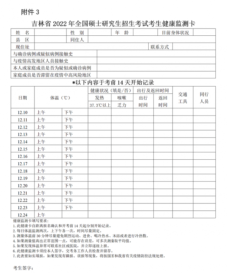 2?? 做好自我健康監(jiān)測。從考前第14天開始,所有考生需下載、填寫《吉林省2022年全國碩士研究生招生考試考生健康監(jiān)測卡》(詳見吉林省教育考試院官方網(wǎng)站,請考生自行下載打印),填報(bào)個人身體狀況。
