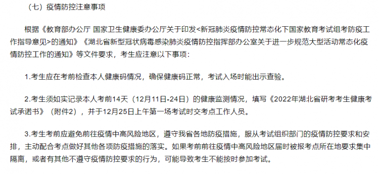 2?? 考生須如實(shí)記錄本人考前14天(12月11日-24日)的健康監(jiān)測情況,填寫《2022年湖北省研考考生健康考試承諾書》,并于12月25日上午第一場考試時(shí)交考點(diǎn)工作人員。