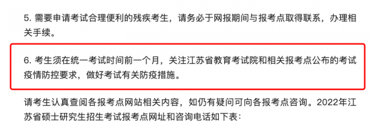 考生須在統(tǒng)一考試時(shí)間前一個月,關(guān)注江蘇省教育考試院和相關(guān)報(bào)考點(diǎn)公布的考試疫情防控要求,做好考試有關(guān)防疫措施。