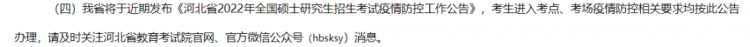 將于近期發(fā)布《河北省2022年全國碩士研究生招生考試疫情防控工作公告》??忌M(jìn)入考點(diǎn)、考場疫情防控相關(guān)要求均按此公告辦理,請及時(shí)關(guān)注河北省教育考試院官網(wǎng)、官方微信公眾號(hbsksy)消息。