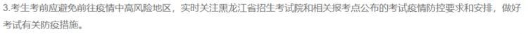 考生考前應(yīng)避免前往疫情中高風(fēng)險(xiǎn)地區(qū),實(shí)時(shí)關(guān)注黑龍江省招生考試院和相關(guān)報(bào)考點(diǎn)公布的考試疫情防控要求和安排,做好考試有關(guān)防疫措施。