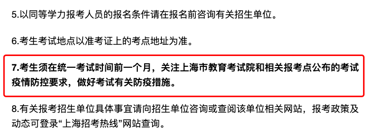 考生須在統(tǒng)一考試時(shí)間前一個月,關(guān)注上海市教育考試院和相關(guān)報(bào)考點(diǎn)公布的考試疫情防控要求,做好考試有關(guān)防疫措施。