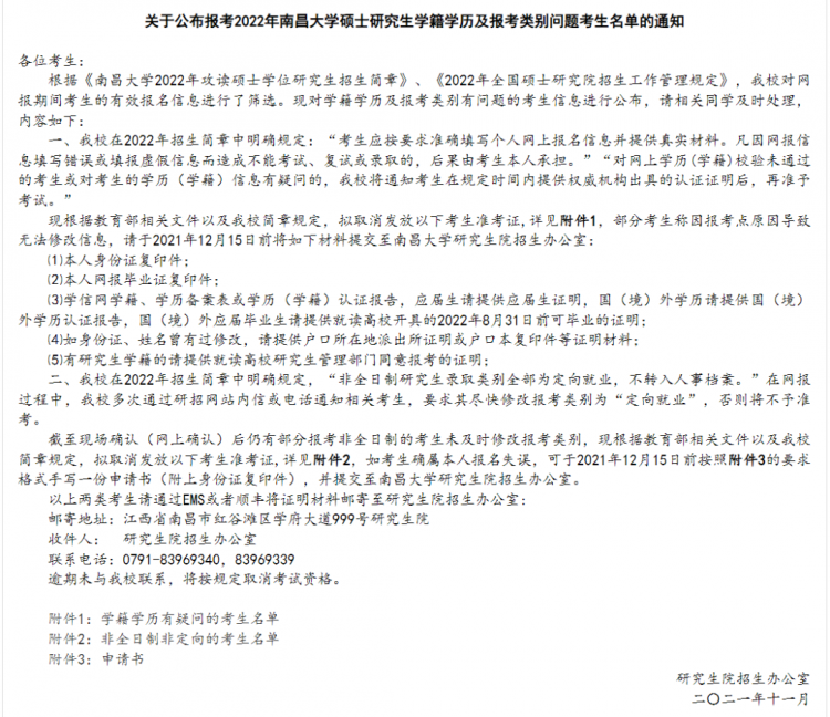 1.《關(guān)于取消部分2022年報考南昌大學(xué)碩士研究生考生考試資格的通知》公示了未如實填寫違紀(jì)情況考生名單和不符合報考條件考生名單。