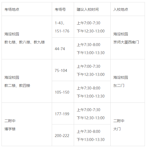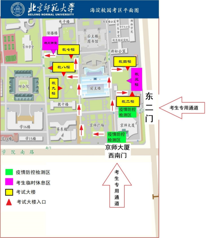特別提示:海淀校園東二門、京師大廈西南門至最遠考試樓步行時間約為10分鐘。