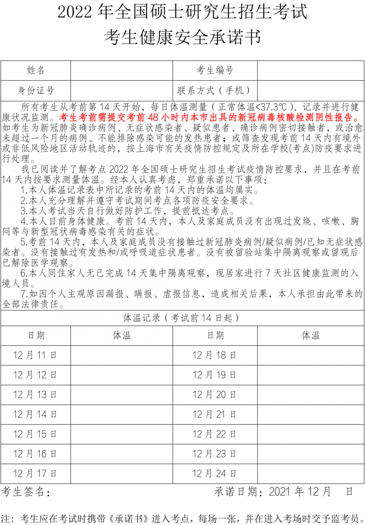 請考生在“上海招考熱線”網(wǎng)站(www.shmeea.edu.cn)重新下載打印新版《2022年全國碩士研究生招生考試考生健康安全承諾書》,并如實填報。