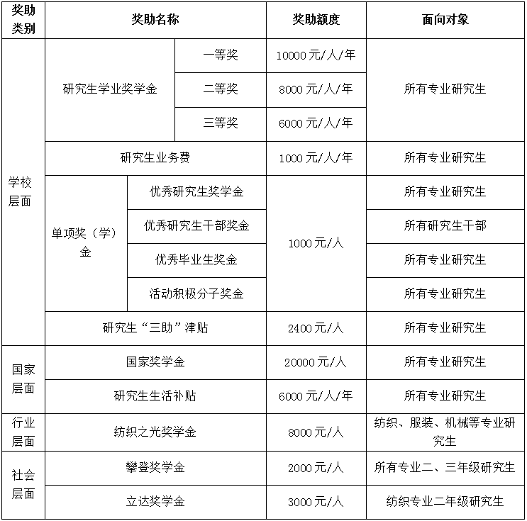 1.我校研究生獎助體系健全,設有國家層面、行業(yè)層面、社會層面及學校層面等四大類共10余種獎助學金。詳情如下表:
