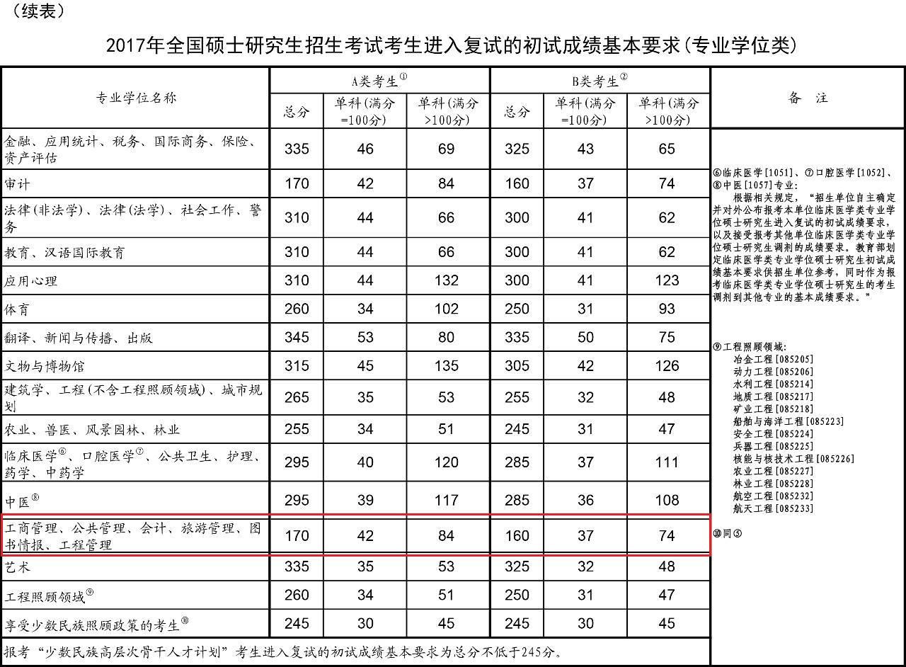 導(dǎo)讀:2017年碩士研究生招生復(fù)試資格基本線已公布,其中MEMA線為:170 84 42,B線為160 74 37。具體如下: