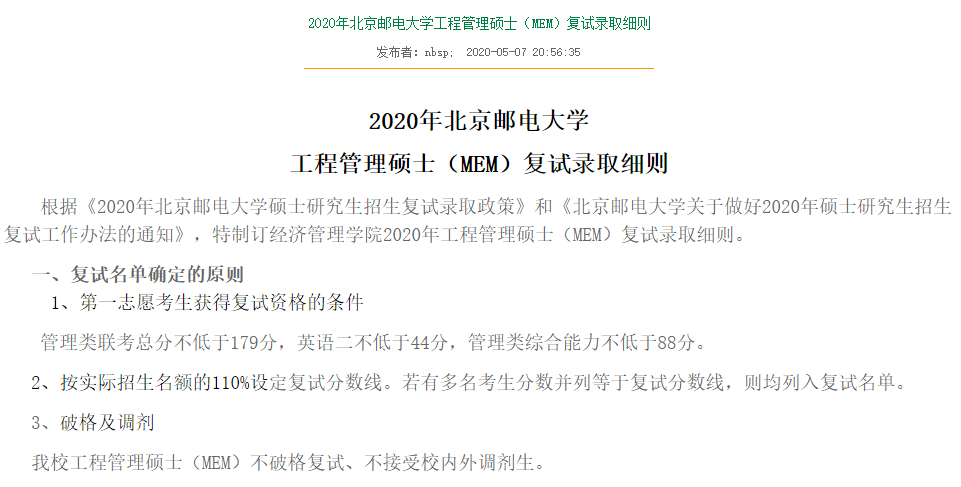 北京郵電大學(xué)2020年MEM(工程管理)復(fù)試基本分?jǐn)?shù)線:179/88/44