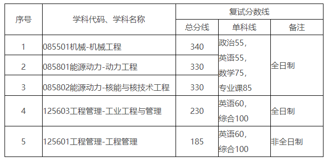 4、復(fù)試分數(shù):085501機械工程、085801動力工程、085802核能與核技術(shù)工程的復(fù)試滿分200分;125603工業(yè)工程與管理的復(fù)試滿分為300分。