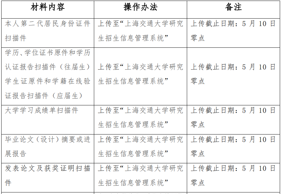 在2020年5月9日前將所有材料上傳到上海交通大學(xué)研究生招生網(wǎng):http://ga.sjtu.edu.cn/ksxt,登錄名為考生本人身份證件號(hào)碼,密碼為考生編號(hào) 未及時(shí)上傳資格審查材料將影響復(fù)試資格。