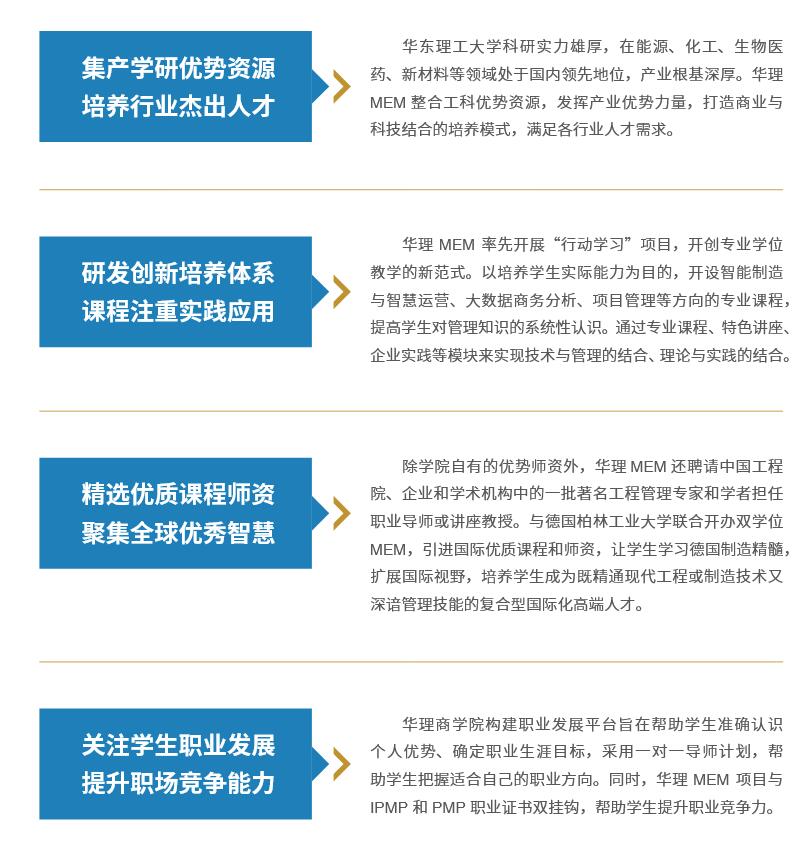 華理MEM課程體系緊密結合產(chǎn)業(yè)特點,重點研究智能制造、大數(shù)據(jù)分析、項目建設的主要管理模式與發(fā)展演化、模式要素與關系、新模式的創(chuàng)新與應用,其期標是讓畢業(yè)生成為兼具理論知識和產(chǎn)業(yè)知識的管理人才。