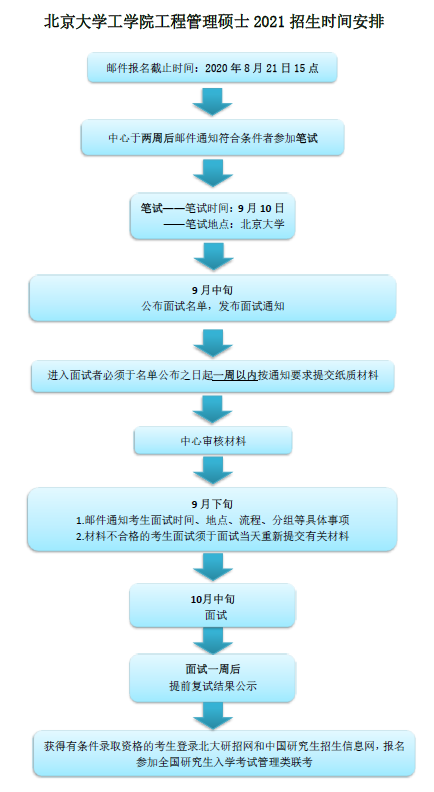 注:①、所有報考北京大學工學院工程管理碩士的考生,必須參加提前復試才可獲取報考資格,即未經提前復試而直接參加全國聯考者,無論成績高低均不予錄取。②、每階段具體流程請參閱后文各分項介紹。