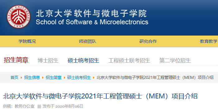 《北京大學(xué)軟件與微電子學(xué)院2021年工程管理碩士(MEM)項(xiàng)目招生說(shuō)明》。