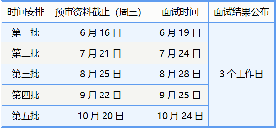 ① 報(bào)名表格及申請(qǐng)材料提交時(shí)間為每個(gè)批次面試前兩天截止,否則請(qǐng)參加下次面試。