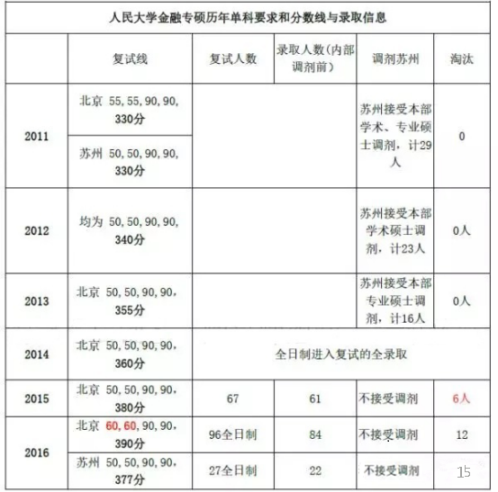 (1)對(duì)2014的擴(kuò)招的解讀:2013年9月人大公布簡章,其中北京統(tǒng)考名額20人,蘇州統(tǒng)考名額30人,最終分別錄取91人與46人。由此可見,北京院擴(kuò)招比率較高,據(jù)我們判斷,這應(yīng)該是因?yàn)閍蘇州學(xué)院完全獨(dú)立招生,北京的導(dǎo)師資源得到充分利用。b最初簡章上50人的非全日制項(xiàng)目大幅度減少,提供多余名額(非全日制金融碩士項(xiàng)目之前央財(cái)金融院試行過,效果不佳。也許是財(cái)金院吸取教訓(xùn),中途放棄了)。盡管北京方向的考生不能再調(diào)劑蘇州,但其招生名額的增加也可以視為對(duì)此的補(bǔ)償。相比清華道口60人、北大光華70人、中財(cái)金院40人和貿(mào)大金院60的錄取規(guī)模,人大90人的擴(kuò)招進(jìn)一步提高了其報(bào)考的性價(jià)比。但是這這個(gè)良好的性價(jià)比在2015銷聲匿跡了,2016年也應(yīng)該沒了。畢竟學(xué)校條件資源有限,尤其是教師資源,因?yàn)槊總€(gè)老師最多能帶5個(gè)專碩(含非全日制),3個(gè)學(xué)碩。這么算下來每屆大概也就140人,全日制110人左右(含推免)。