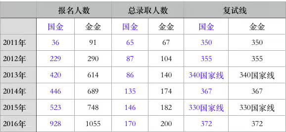每年都有很多同學(xué)想要了解國金和金金哪個難,這個問題真的沒法給出具體的答復(fù),因為“難”這個字很難定義,下面給出兩個學(xué)院2011-2016年的報錄比和復(fù)試線,大家自己對比一下,因為2017年沒有官方數(shù)據(jù),這里就沒有列出。