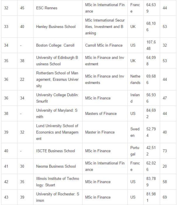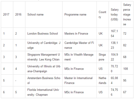 2017年Post-experience(需要工作經驗)金融碩士排名