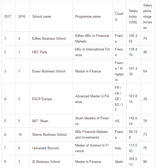 2017年排行榜的前幾名幾乎清一色都是法國商學院。校區(qū)位于里爾和尼斯的北方高等商學院(Edhec Business School)首次登上該榜單榜首。自2011年該榜單編制以來一直排名第一的巴黎高等商學院(HEC Paris)如今降至第二名。
