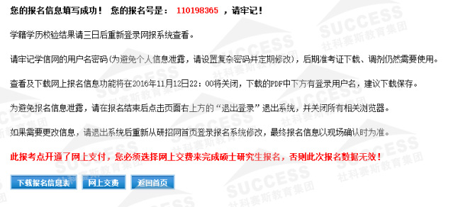 6、 生成報名號后本次報名才為成功(如果選擇的報考點需要網(wǎng)上交費,那么交費成功后才算報名成功),請系統(tǒng)查看,牢記報名號,現(xiàn)場確認時提供給報考點。