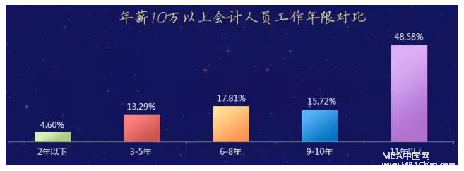 總體上看,會(huì)計(jì)行業(yè)是一個(gè)“厚積薄發(fā)”的行業(yè),隨著工作年限的增長(zhǎng),對(duì)會(huì)計(jì)工作了解的更加深入,經(jīng)驗(yàn)更加豐富,因此想獲得相對(duì)比較好的薪水需要在這個(gè)行業(yè)不斷沉淀自己,從上圖可以看出,薪水超過(guò)10萬(wàn)的會(huì)計(jì)人當(dāng)中,工作年限3年以上的人數(shù)占比高達(dá)95%,會(huì)計(jì)工作很穩(wěn)定,值得大家托付一輩子。