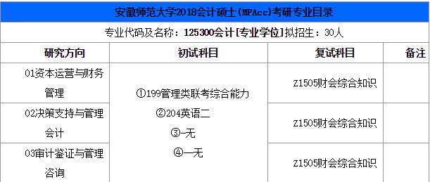 導(dǎo)讀:小編為考生整理了安徽師范大學(xué)2018會(huì)計(jì)碩士(MPAcc)考研專業(yè)目錄,僅供您參考!